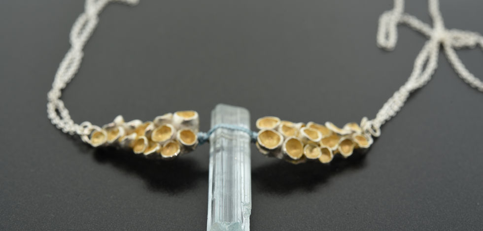 zilver, bladgoud, ongeslepen aquamarijn, zijde